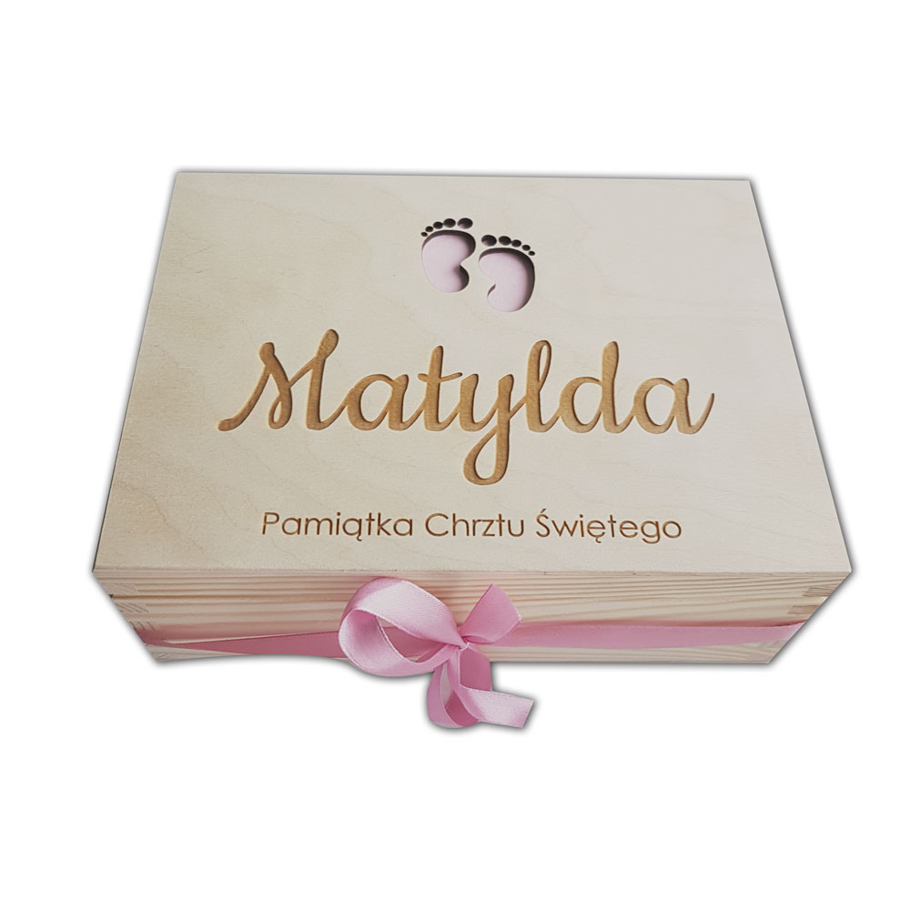 Pudełko ze stópkami, imieniem i metryczką o wymiarach 22x16x8 cm.