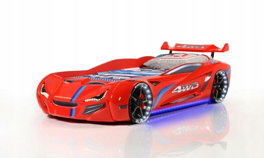 Aukcja dotyczy łóżka w kształcie auta GT Turbo. Błyszcząca karoseria imitująca lakier samochodowy, oświetlenie LED, dźwięki, pilot oraz sportowa sylwetka.