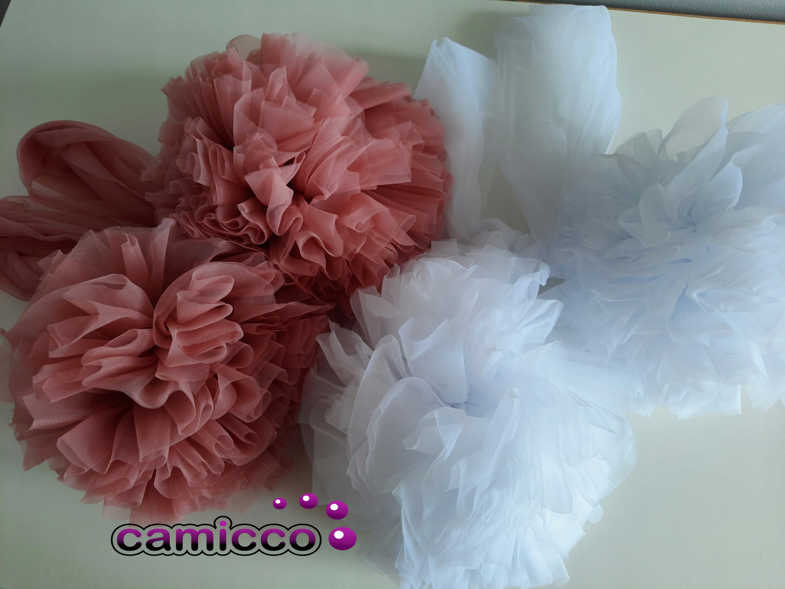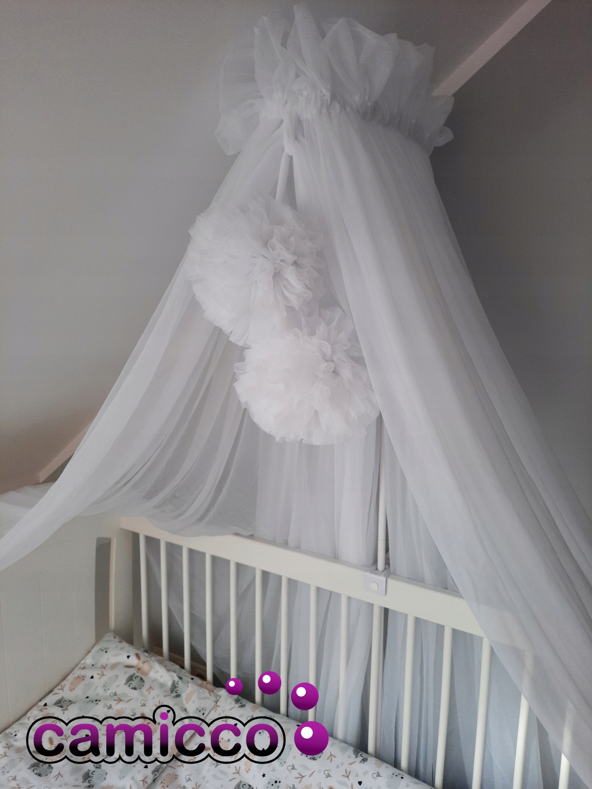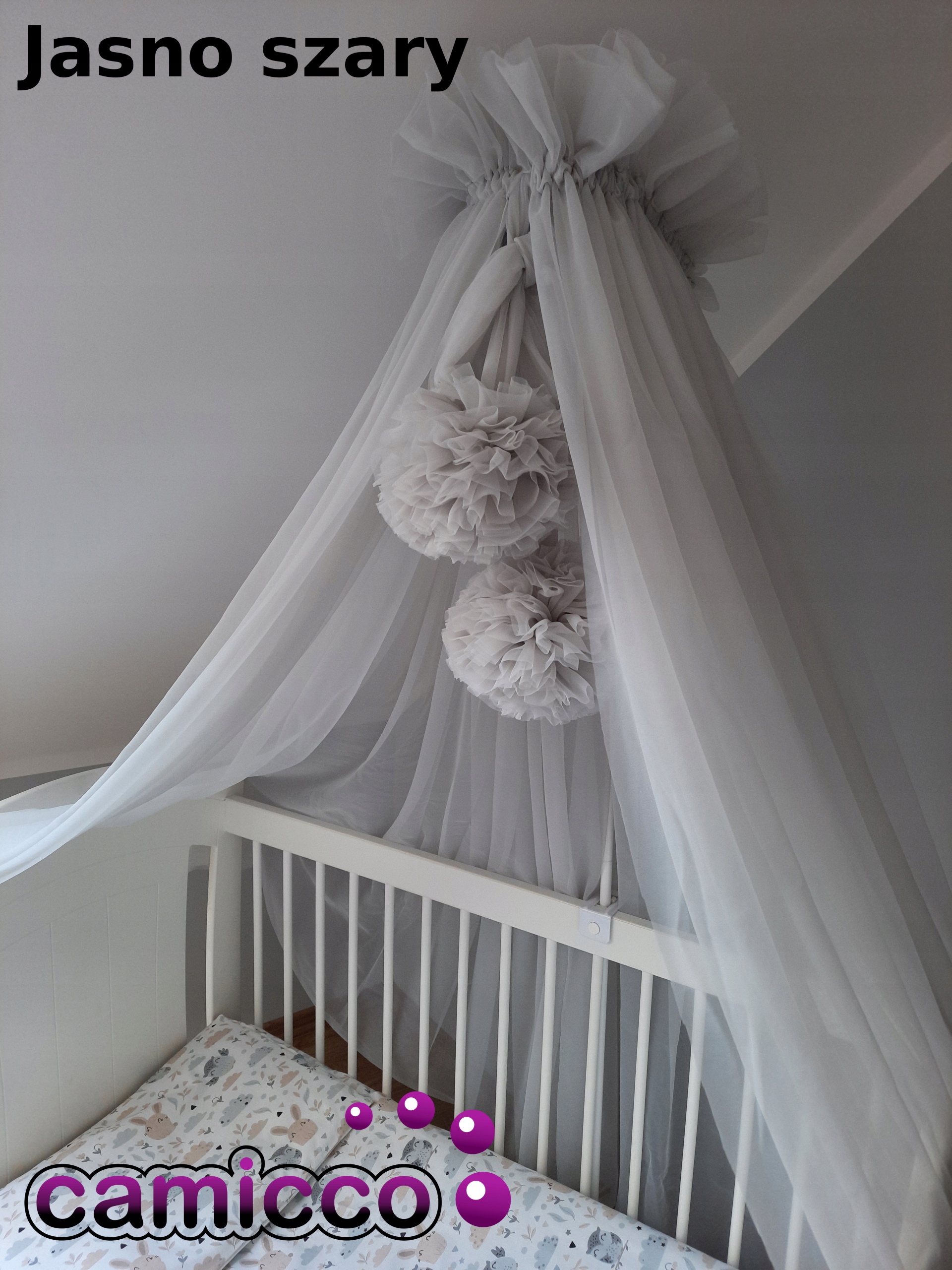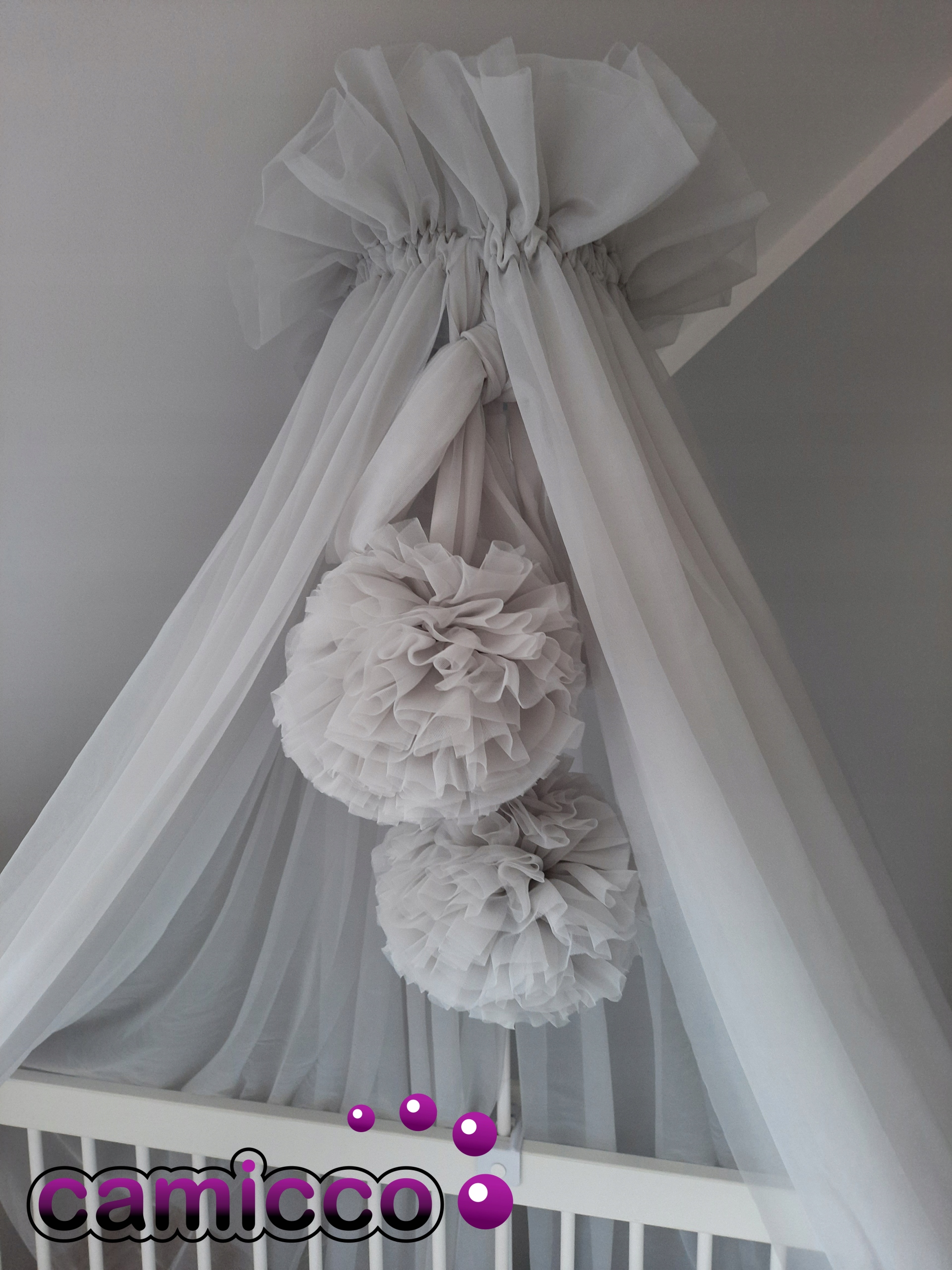 Uniwersalny baldachim wykonany jest z tiulu szyfonowego + 2 pompony z estetycznym wykonaniem