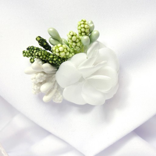 Шпилька виготовлена з білих квітів з додаванням зелені, виготовлена з поролону та тканини. Прикрасу можна закріпити будь-де. Його слід зняти перед пранням сумки.