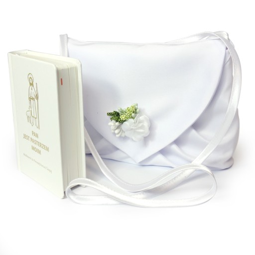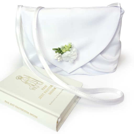 Communion bag - клатч.Пропонуємо сумку для причастя, призначену для носіння на плечі. Для цього до сумки прикріплений тонкий атласний ремінець. Сумка біла, типу клатч, застібається на липучку. Клапан сумки прикрашений шпилькою-квіткою. Сумку можна прати вручну або в пральній машині. У сумку легко поміститься молитовник, чотки, носові хустинки.