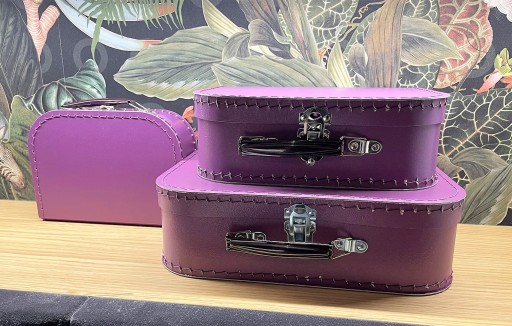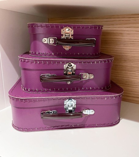 Набір декоративних валізв красивомуінтенсивний фіолетовий колір. Валізивони зшиті пурпуровою ниткою, закритіметалева засувкаі мають металопластиковутримати ручку.І