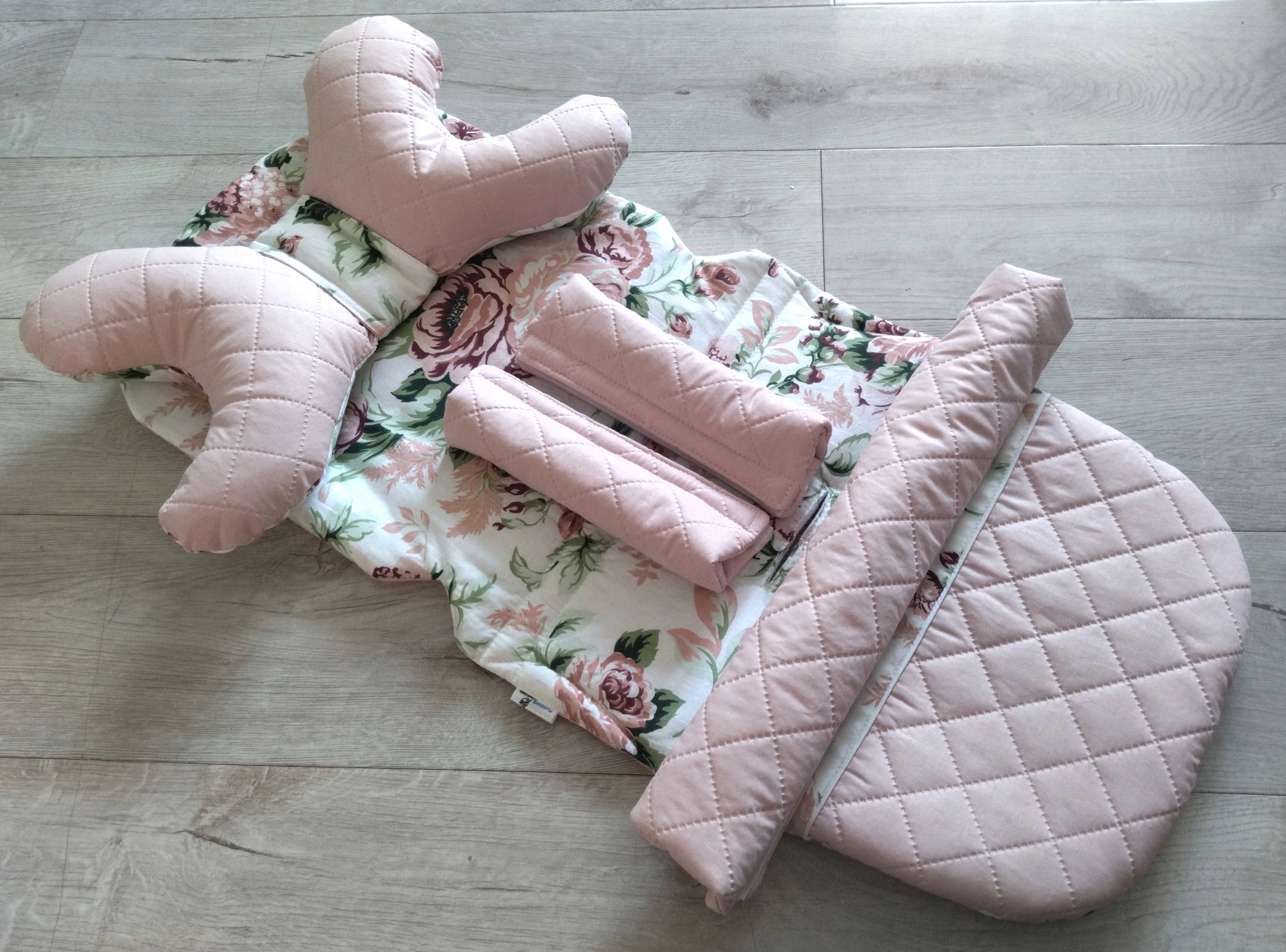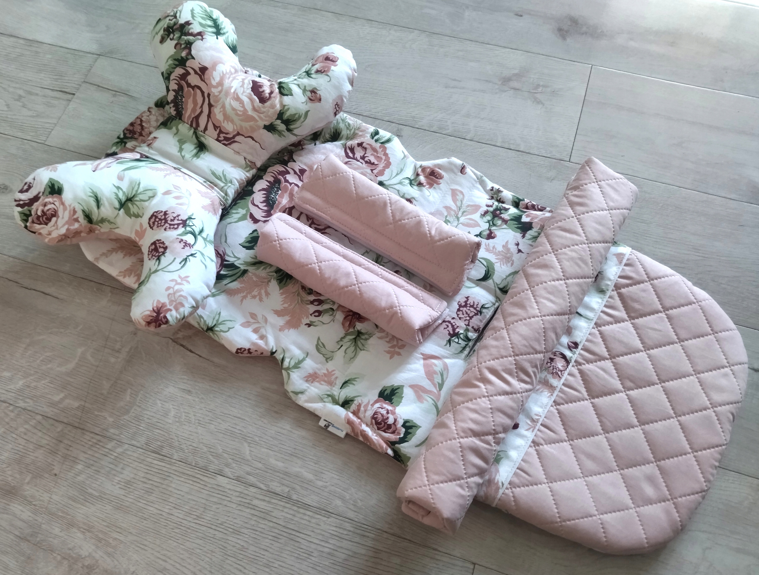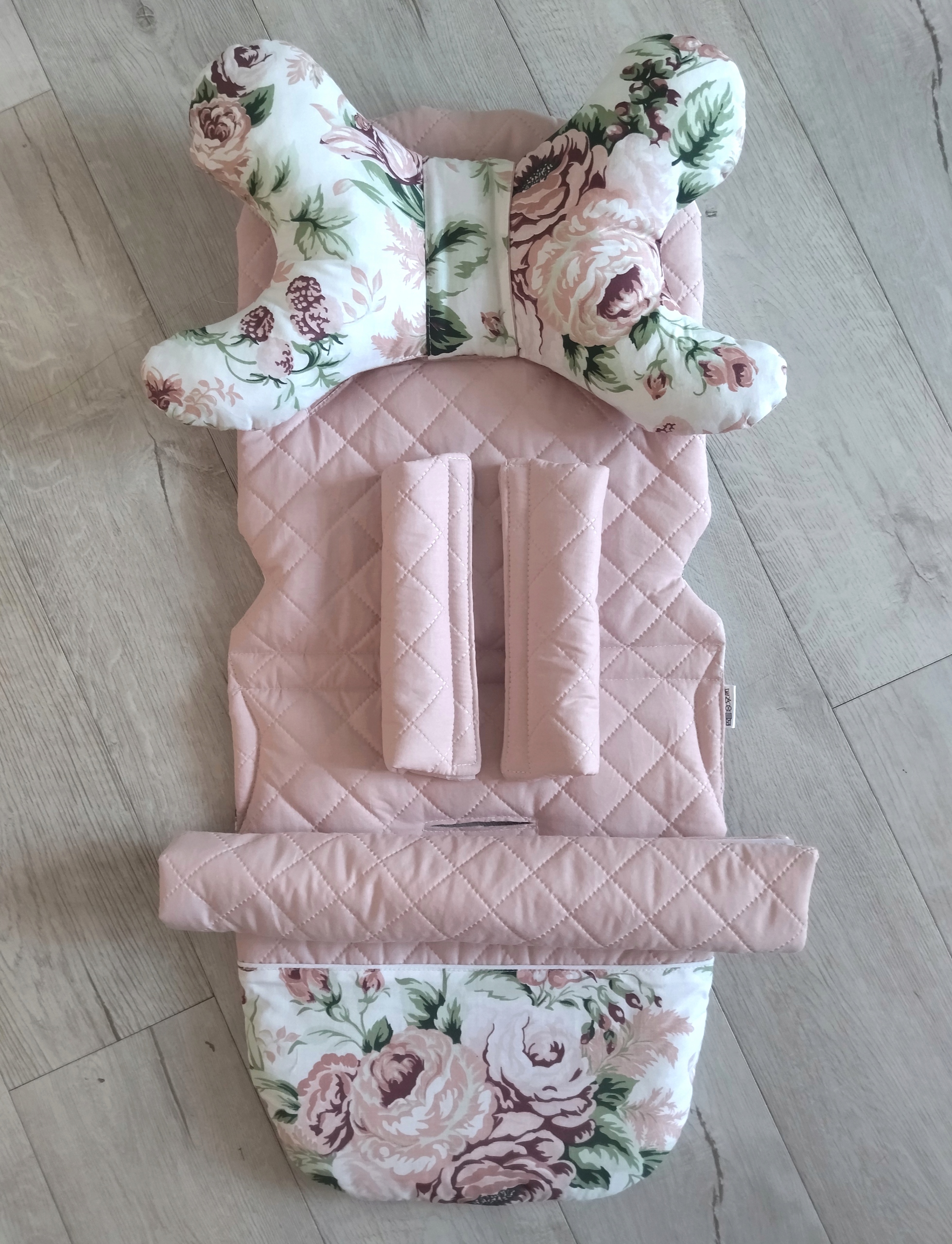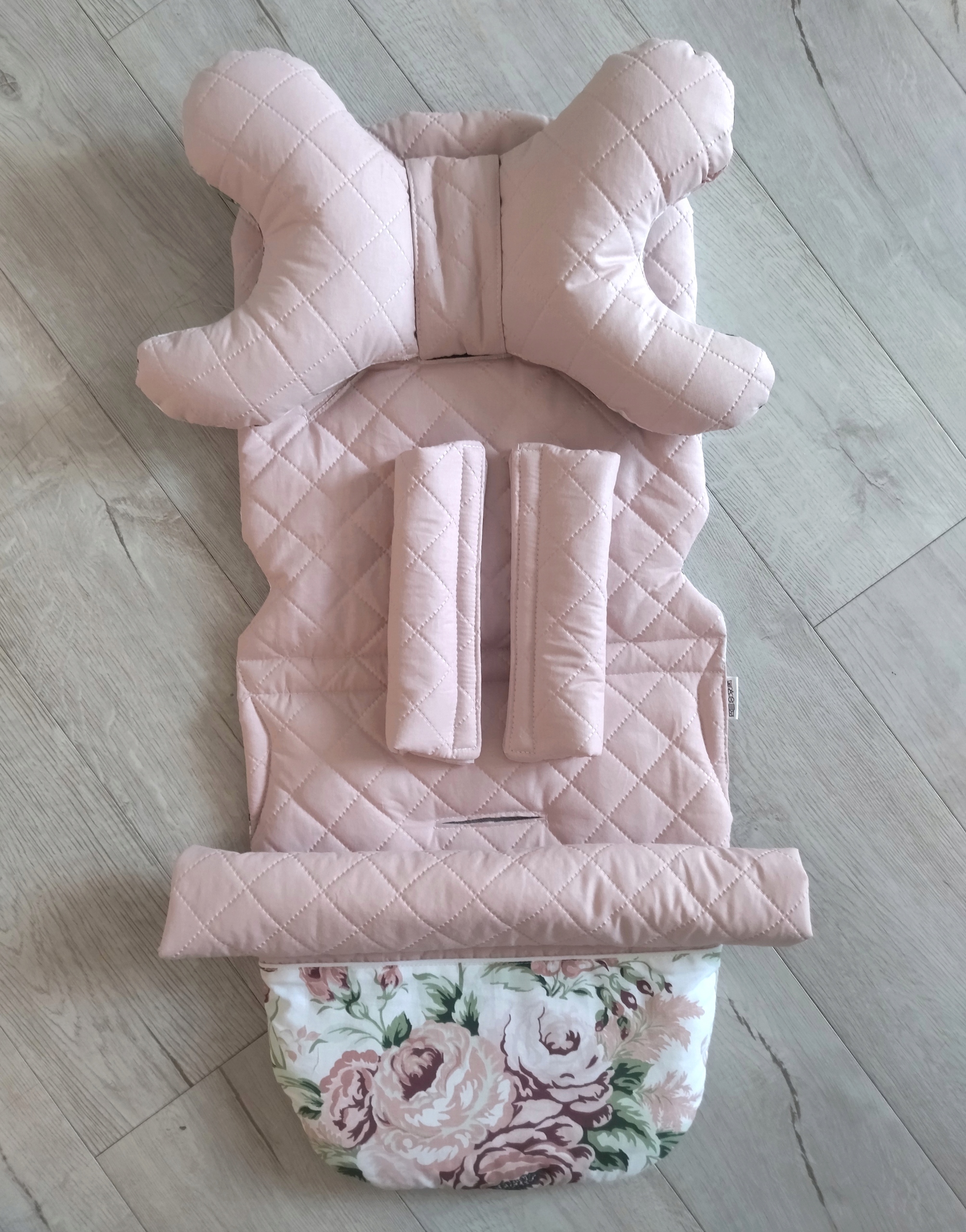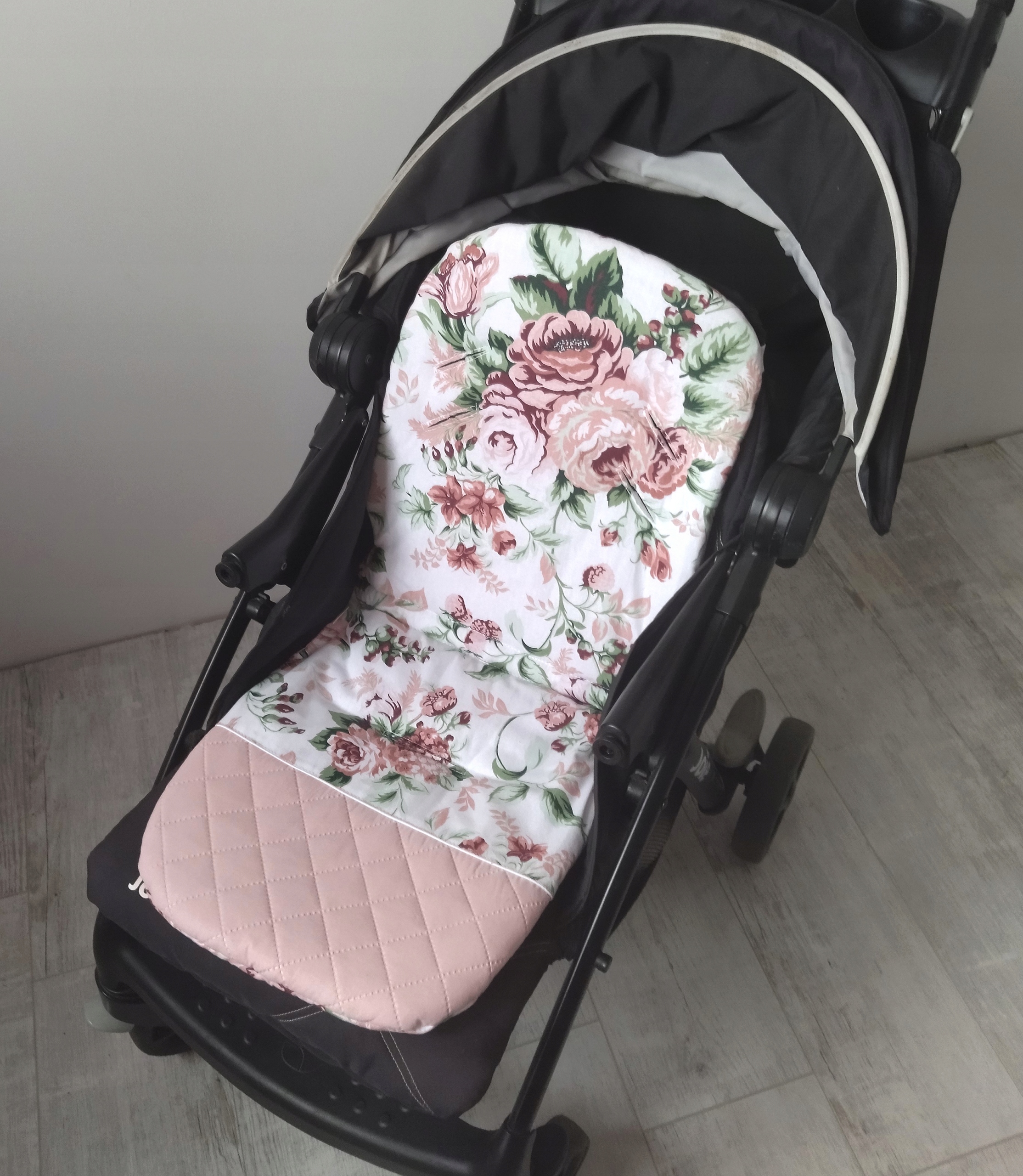 - wkładkę do wózka spacerówki ROSE w kolorze pikowany brudny róż + kwiaty róże cygańskie pudrowy róż.
