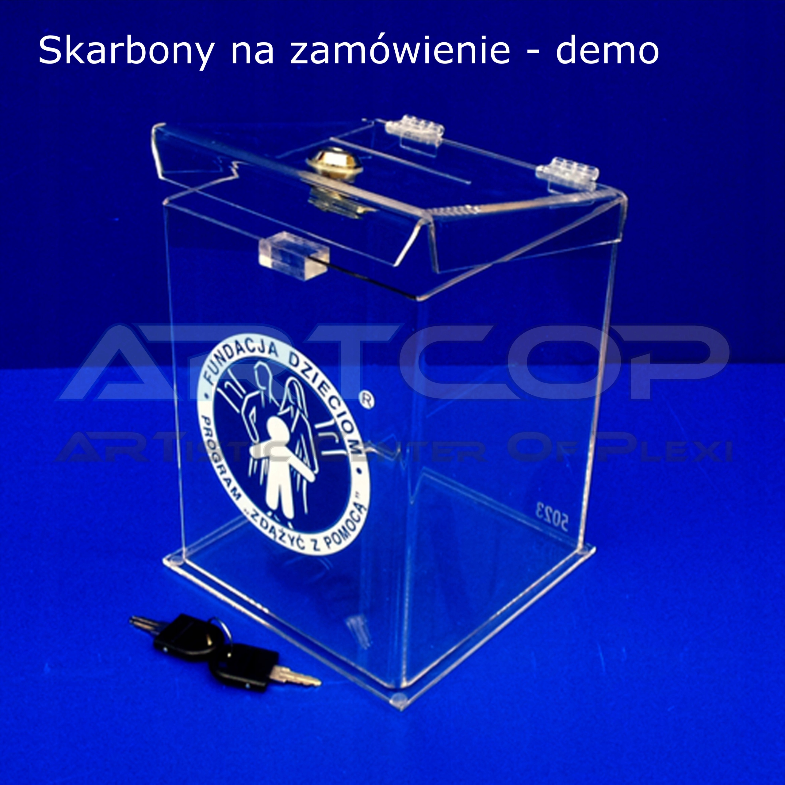 Firma ARTCOP opracowała proste, ale jednocześnie unikalne wieko skrzynki, co sprawia, że fundusze wewnątrz jej są lepiej chronione. Klapa z bocznymi zagięciami, to nasz pomysł na udoskonalenie skarbonki. Został poparty doświadczeniami i testami jakie zrobiliśmy kilka lat temu. Nasze rozwiązanie chętnie kopiują inne firmy, ale ten kształt wieka jest naszym "patentem" opracowanym w firmie ARTCOP. Kiedy publikowaliśmy pierwsze fotki w internecie z naszym opracowaniem, nikt w Polsce i Europie takich nie proponował. Dziś wszyscy chętnie je wdrażają.