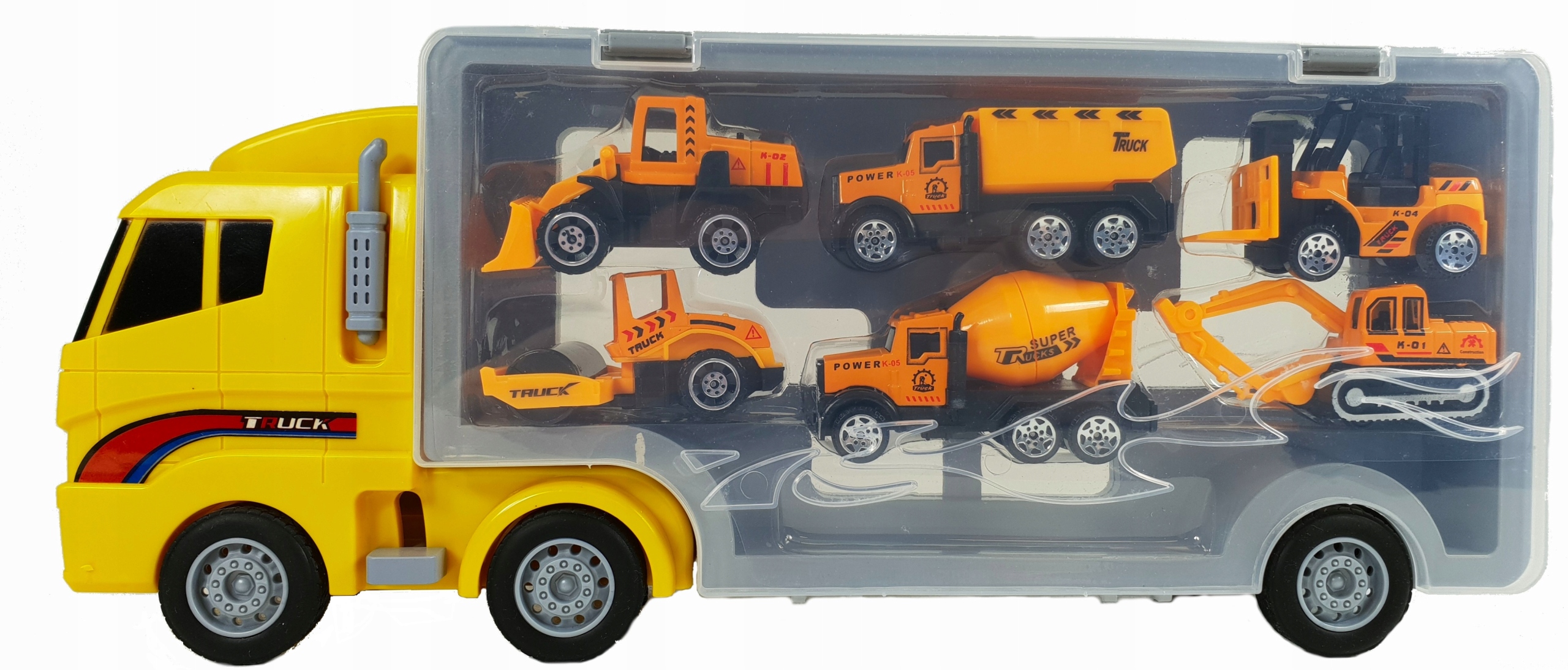Zestaw składa się z tira, oraz 6 maszyn budowlanych. Posiada funkcję rozkładania, dzięki której bez problemu można wyjąć samochodziki z lawety. Zabawka wykonana została bardzo dokładnie, odwzorowując wszystkie szczegóły. Każdy pojazd budowlany został bardzo szczegółowo wykonany. Transporter na 6 dużych gumowych kołach.