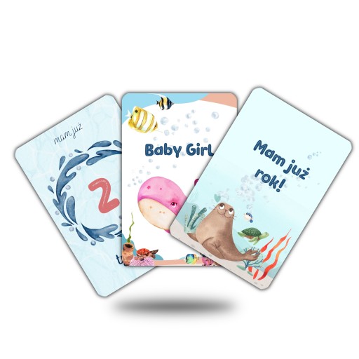 У набір входить 44 барвисті графічні композиції в кліматі Блакитної лагуни, надруковані на 22 картках. Картки універсального розміру 10х15 см (+/- 1мм), завдяки чому вони чудово підійдуть для фотографій з маленькою дитиною.