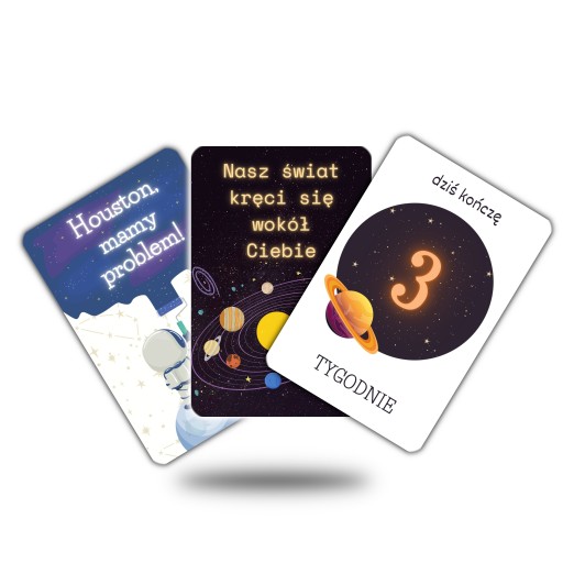 У набір входять 44 барвисті графічні композиції в тематиці Космос, надруковані на 22 картках. Картки універсального розміру 10х15 см (+/- 1мм), завдяки чому вони чудово підійдуть для фотографій з маленькою дитиною.