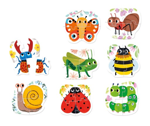 Дворічний малюк уважно спостерігає за оточенням. Він щодня вивчає нові слова, стає все більш самостійним, набуває та вдосконалює різноманітні навички. Гра — найкращий спосіб для нього пізнавати світ. Пазли з четвіркою жуків дозволяють розвивати дрібну і загальну моторику, сприйнятливість і уяву. Вони надихають на розмови про тварин і вивчення нових слів.
