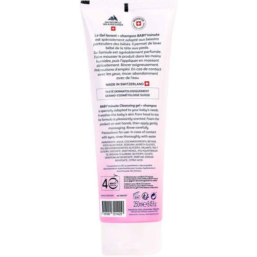 BABY minute Швейцарський гель для вмивання і шампунь 2в1. Спеціально розроблена формула була адаптована до ніжної шкіри немовлят і маленьких дітей. Ніжно очищає, зволожує та пом'якшує шкіру малюка. Дерматологічно протестований продукт. Гель збагачений провітаміном В5, який має пом'якшувальні та зволожуючі властивості. Не містить феноксіетанолу, парабенів, мінеральних масел, барвників, алергенів, силіконів і мила.