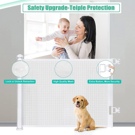 - ãВисувна конструкція¸Висувні дитячі двері мають ширину (150 см) і висоту (85 см), розроблені для будь-якої ширини дверей/сходів. Сітку можна повністю заховати, коли вона не використовується, заощаджуючи місце.