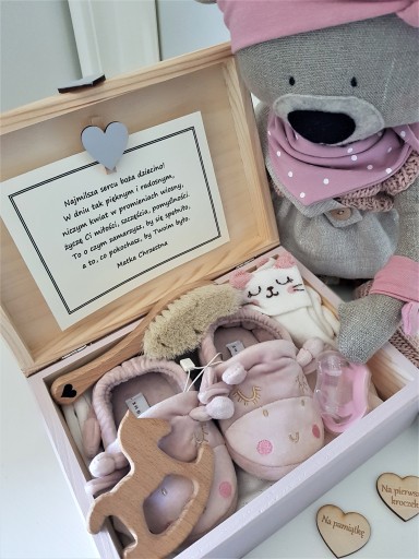 Гаджети на фотографіях (наприклад, шкарпетки, черевики, соска, конячка тощо) не продаються - це лише приклад вмісту коробки. Плюшевий ведмедик на задньому плані на фотографіях також не є пропозицією до продажу - це лише елемент декору фото.