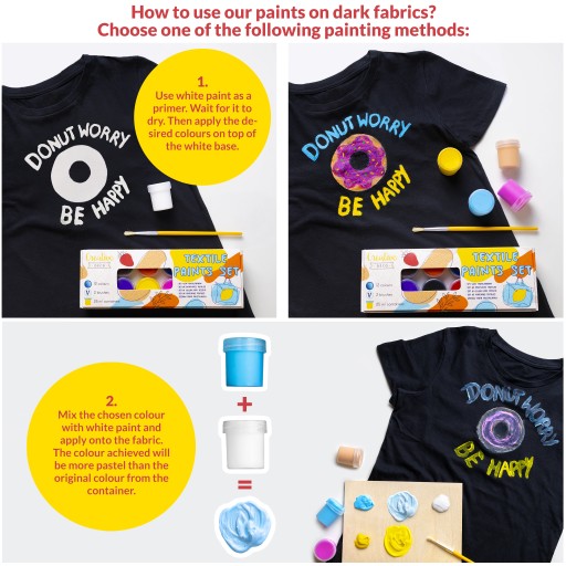 ЗАСТОСУВАННЯ - Фарби можна наносити пензлем або губкою, забезпечуючи увагу до деталей. Примітка: малюючи на темних тканинах, виберіть один із таких способів малювання: 1. Використовуйте білу фарбу як основу для тканини. Після висихання можна наносити фарби на білу основу. 2. Змішайте обраний колір з білою фарбою і нанесіть на тканину. Отриманий колір буде більш пастельним, ніж колір у контейнері.