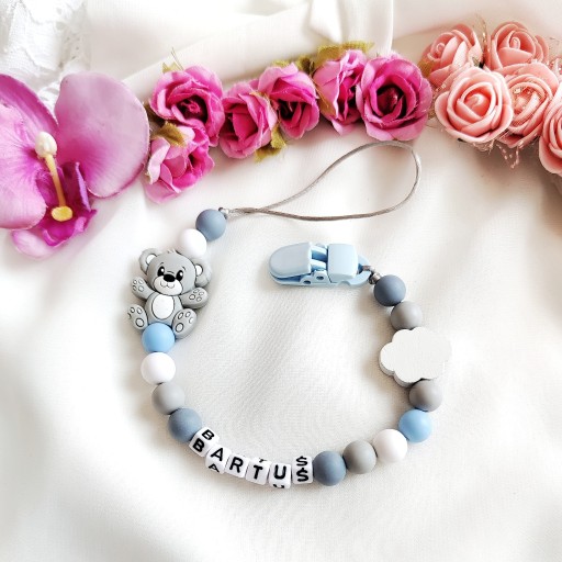 - З іншого боку він закінчений шнурком, який дозволяє прикріпити пустушку.