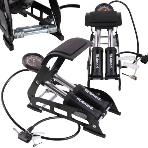 Двопоршневий опорний насос міцної конструкції, виготовлений з точеного лакованого сталевого листа товщиною 3 мм. Для кращої стабілізації педаль покрита гумою. Манометр, який легко зчитується, показує бар (0-11) і PSI (0-160). Міцний і гнучкий, довжиною 750 мм. Три адаптери в комплекті. Ідеально підходить для професійних послуг і домашніх господарств.