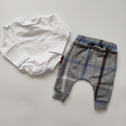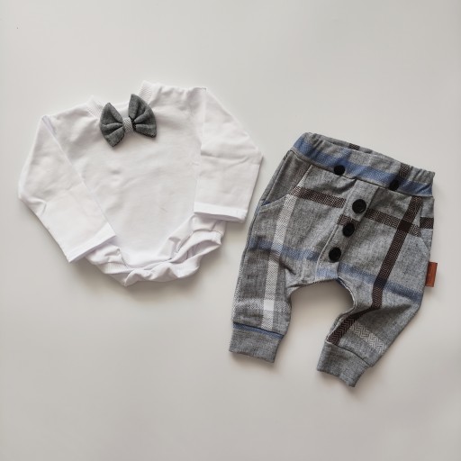 Елегантний бавовняний одяг для хлопчика з унікальним малюнкомсиньо-коричневий плед на сірому тлі. Білий Тедді з картатим метеликомМішкуваті штани зі знімними підтяжками, еластичний пояс і чорні гудзики.