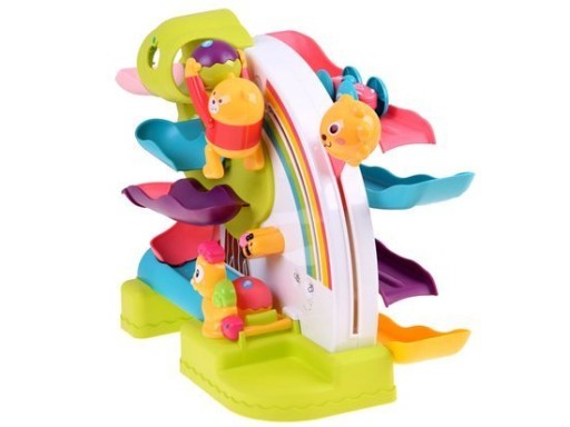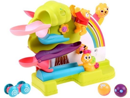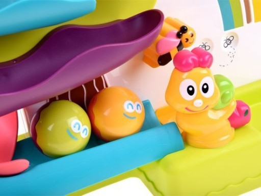 Доріжка складається з чотирьох рівнів, на нижню доріжку помістіть обидві кульки так, щоб вони зупинилися на равлику. Витягнувши важіль з голови лева, він робить перекид і м'яч. Відпускаючи важіль, він знову повертається і кидає м'яч на найвищу доріжку. Кулька скочується по наступних елементах доріжки під веселу музику, її гучність можна регулювати. Також можна грати без музики (перемикач знаходиться на білій панелі). Іграшка живиться від 2х батарейок АА (не входять в комплект).