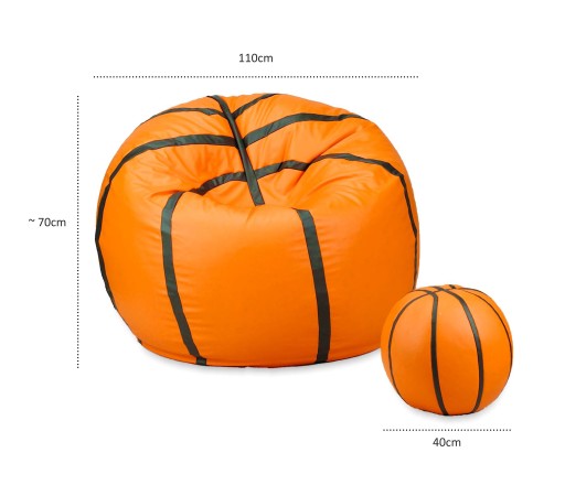 Предметом аукціону є м'яч-пуф "Баскетбол" об'ємом 550л з підставкою для ніг об'ємом 35л. Кольоровий варіант вибирати при покупці з наявних моделей за шаблоном або складати самостійно. Інструкції щодо вибору кольорів описані в тексті нижче. Розміри пуфа: ширина 110 см, глибина 110 см і висота 70 см. Зверніть увагу, що пуф є безкаркасним предметом меблів, тому його розміри можуть відрізнятися в залежності від ваги користувача та розташування пуфа. Пуф і підніжка стандартно наповнюються сумішшю гнучких матеріалів для виробництва меблів, які забезпечують довговічність і комфорт використання. Матеріал, з якого він виготовлений - екошкіра доларо, також сертифікована Національним інститутом гігієни Польщі.