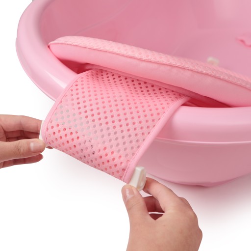Вставка має універсальні пластикові кріплення, які кріпляться до бортів ванни. Сама вставка виготовлена з перевіреного синього матеріалу, який швидко висихає, і розроблена таким чином, щоб тіло дитини було правильно сформовано та нахилено під час купання. Шви тканини не чіпають малюка. Виготовлений якісно, тому прослужить вам довгий час, не втрачаючи форми та кольору.