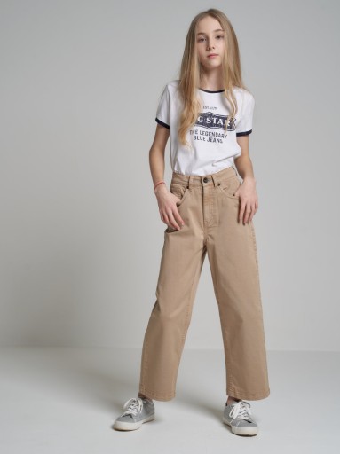 Вам подобається модний одяг, натхненний останніми трендами? Вам обов'язково сподобаються штани для дівчаток з широкими штанинами, які сягають трохи вище щиколотки. Завдяки завищеній талії вони чудово виглядають з короткими блузами або заправленими футболками. Штани виготовлені з приємної на дотик бавовняної тканини з додаванням еластомультіестеру, що запобігає висування матеріалу на рівні колін. Штанини застібаються на блискавку. Вони мають дизайн із 5 кишенями та доступні у світло-коричневому кольорі.