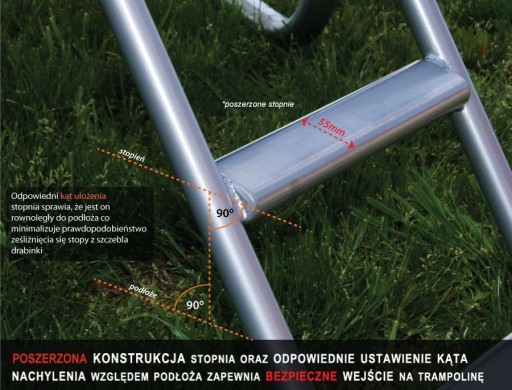 - У верхній частині конструкції драбина закінчується гачками, які кріпляться до обода батута