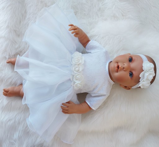 Сукня виконана з білого мережива на атласі, низ з атласу та органзи з вшитою зав'язкою, завдяки чому низ сукні красиво струмує, ззаду застібається на блискавку, зав'язується поясом декорованим дзвіночки