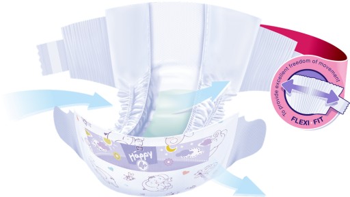 - гнучка система Flexi Fit, широка куліска на талії та широка еластична липучка забезпечують повне регулювання підгузника та виняткову свободу рухів і не створюють тиску на животик.