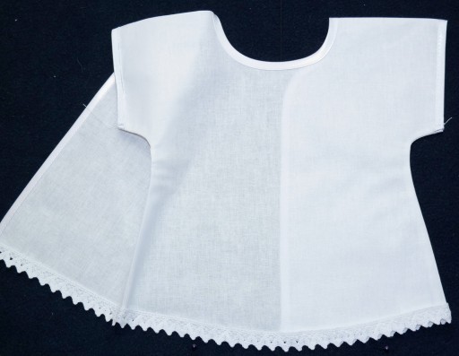 - рукава, горловина та розріз на спині оздоблені білою атласною обробкою, а поділ оброблений білим бавовняним мереживом