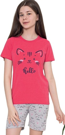 Футболка з коротким рукавом має горловину, оброблену обробкою під колір брюк і декоративним принтом. Шорти з малюнком.