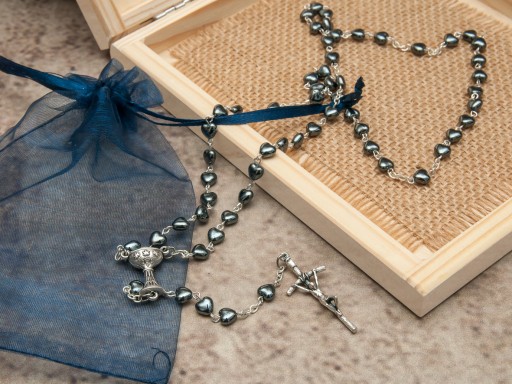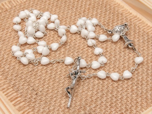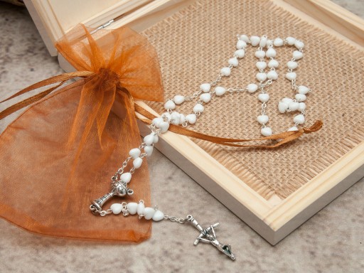 Сувенір Першого Святого Причастя - коробка зі світлого натурального дерева з красивим кльошем у формі серця в барвистому мішечку з органзи.