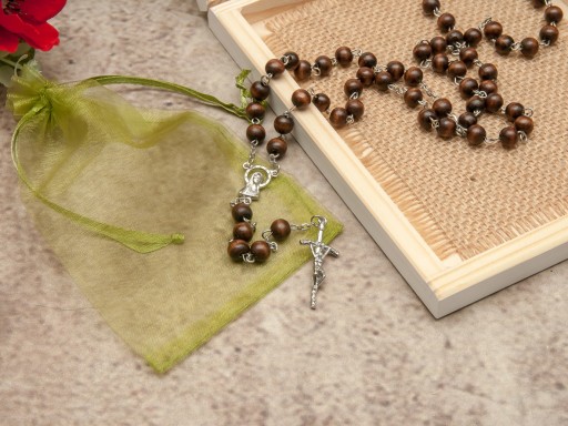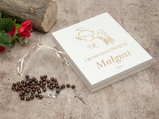 Сувенір Першого Святого Причастя - біла дерев'яна коробка з дерев'яним кльошем в барвистому пакеті з органзи.