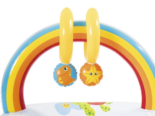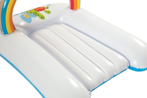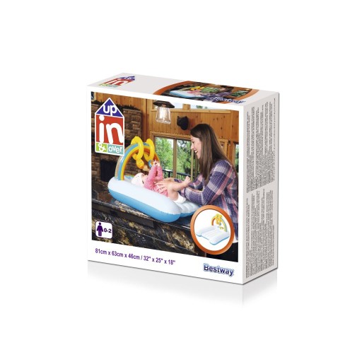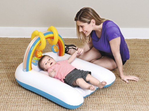 Портативний надувний пеленальний столик забезпечить зручне і легке переодягання дитини під час тривалої поїздки на вихідні або святкові дні. У складеному вигляді він легкий і не займає багато місця в сумці, тож його можна брати практично куди завгодно. Пеленальний столик виготовлений із твердого, перевіреного вінілу та має запобіжні клапани. Для більшого комфорту малюка дно пеленального столика надувне. Іноді буває важко переконати малюка лежати спокійно, особливо коли він втомився після подорожі. Тому над пеленальним столиком дитина знайде пеленку з двома скрипучими іграшками. Цікаві кольори та інтенсивні кольори неодмінно привернуть увагу малюка.