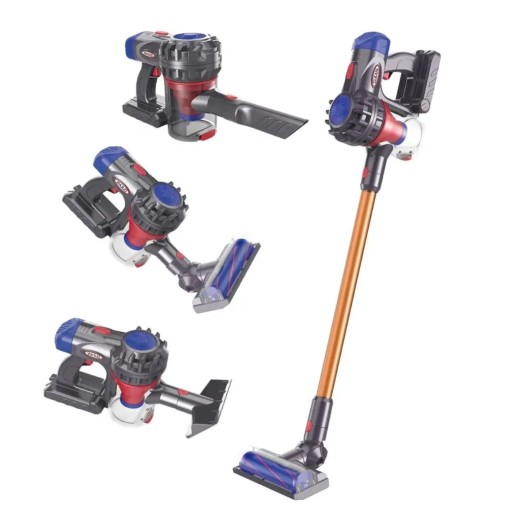 Іграшковий вертикальний пилосос сіро-синього кольору з червоними елементами. Він оснащений функцією всмоктування. Він має знімний контейнер для сміття, який ви можете спорожнити самостійно.