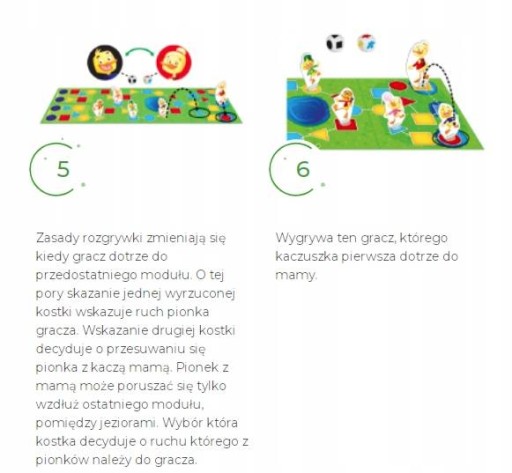 Доступна та оригінальна гра не тільки для найменших. Рухи на дошці базуються на кольорах і формах, викинутих кубиками. Гравці самі приймають рішення про вибір дороги, оцінюючи, який варіант для них вигідніший. Кожна гра може проходити з абсолютно іншою конфігурацією дошки, яку вирішують гравці. У грі ми виступаємо в ролі каченят, які намагаються знайти дорогу до мами. Перемагає той, хто першим досягне мети.