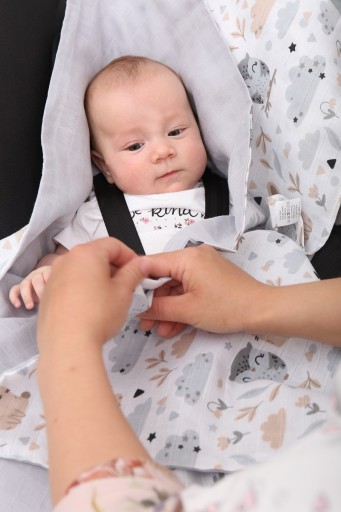 Ковдра має регульовані отвори для будь-яких типів ременів (переноска, коляска, автокрісло, дитячий стільчик). Наша ковдра виготовлена з 2-х шарів пухнастого і легкого мусліну, вона переворотна, тобто ви можете одягати її як вам більше подобається.