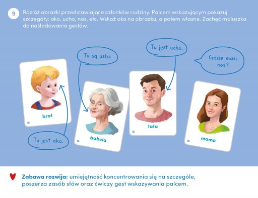 Розвиваючі картки на шнурку дозволять пізнавати світ разом! Книжка містить 32 чудові ілюстрації, які представляють те, що діти знають або можуть знайти у своєму найближчому оточенні. Зручний формат і оригінальна комбінація дозволяють легко грати з картками багатьма креативними способами, що значно сприяє когнітивному розвитку. Ми включили посібник, повний ідей щодо розвитку діяльності.