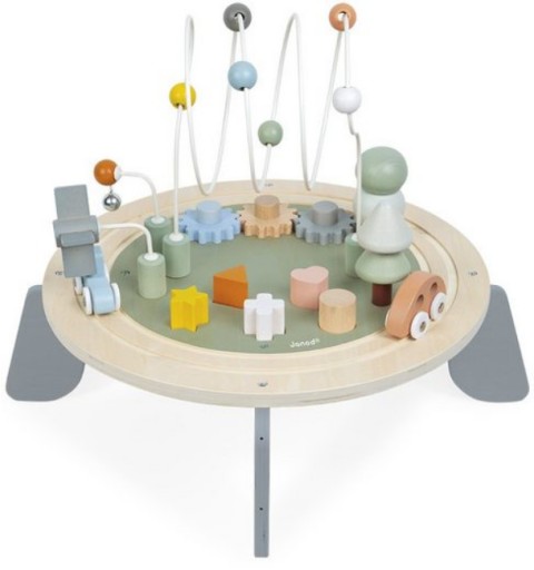 Дерев'яний багатофункціональний розвиваючий стіл із серії Sweet Cocoon французького бренду Janod - ідеальна іграшка для дітей від 1 року. Він має безпечну круглу форму та чотири широко розставлені стійкі ніжки, які можна прикріпити двома способами нижче (тоді стільниця на висоті 14 см) або вище (стільниця на висоті 22,5 см) залежно від зріст дитини.