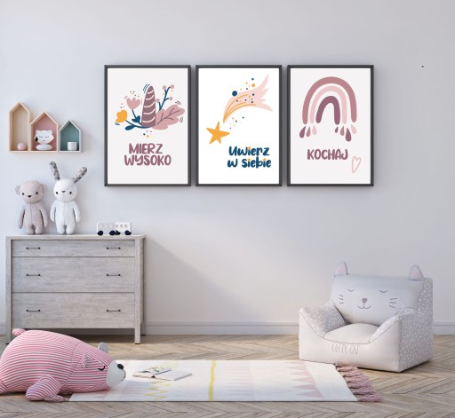 Це не тільки чудова ідея для того, щоб покрити порожні стіни в дитячій кімнаті, але й персоналізувати їх, зробивши малюнки унікальними. Варто обрати наш набір бохо-постерів, де, окрім мотивуючих написів, ми маємо гарно оформлену графіку для дитячої кімнати.