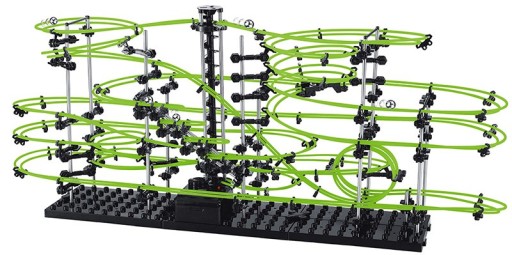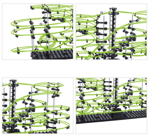 Вся конструкція виконана з металу, пластику і волосіні. Комбінація всіх елементів нарешті дає чудову доріжку, по якій рухаються металеві кульки. Вони одна за одною ковзають вниз по петлях, поки не дістануться до ліфта, який доставить їх на самий верх будівлі, де веселощі починаються знову. Spacerail — це 3D-головоломка, яка підштовхне вашу творчість, оскільки ви можете будувати конструкції, як вважаєте за потрібне, не обов’язково згідно з кроками в посібнику.