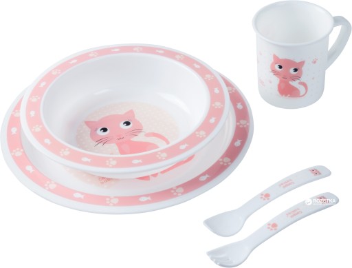 Набір пластикового посуду CUTE ANIMALS з кольоровим принтом. Рекомендовано дітям для навчання самостійного харчування. Набір складається з миски, чашки, тарілки та столових приборів. Підходить для використання в посудомийній машині та мікрохвильовій печі. На наших аукціонах доступний у кількох колірних варіантах.