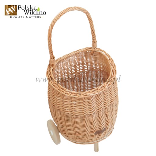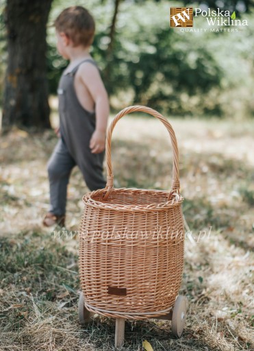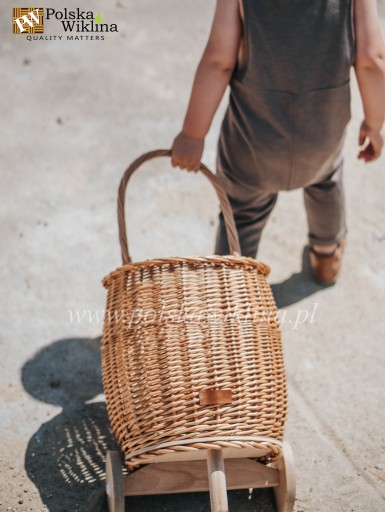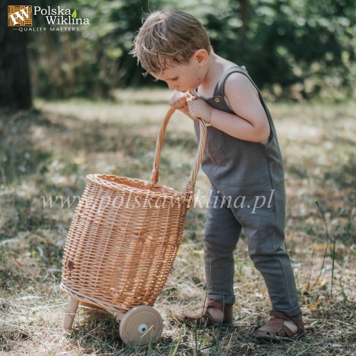- Конструкція: Кошик для іграшок сплетений вручну з лози гілок польських культур. Корпус і ніжка виготовлені з дерева. Колеса регулюються викруткою, щоб вони оберталися. Плетена ручка дозволяє зручно тягнути кошик, а ніжка дозволяє зупинитися і поставити його в будь-якому місці.