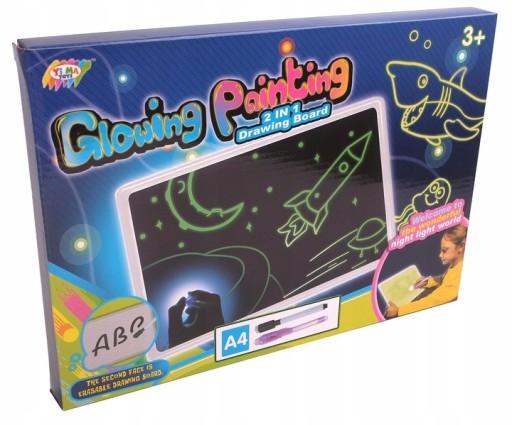 Дошка 2в1це ідеальний подарунок для будь-якої дитини, яка любить малювати. Завдяки цій дошці він також може робити малюнки, якісвітяться в темряві.У набір входять всі необхідні елементи для створення світяться картин. Також додаються зразки шаблонів із візерунками.