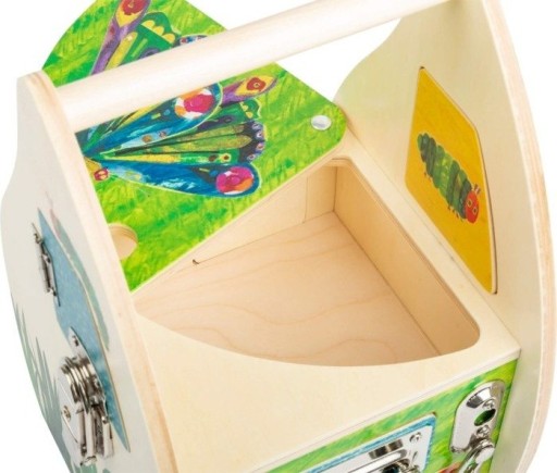 Дерев'яний будиночок із декількома замками. Конструкція маленької ніжки. Дуже голодна гусениця є ідеальним місцем для зберігання дрібниць завдяки своїм прихованим відсікам. Зручна ручка дозволяє легко переміщати іграшку. Конструкція виготовлена з масиву та ламінованої деревини, вона міцна та покрита стильною графікою в інтенсивних та приємних для ока кольорах.