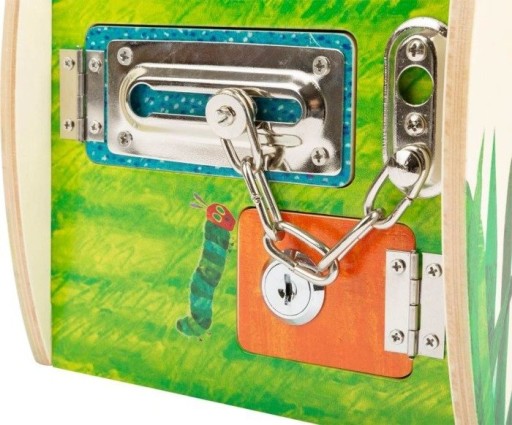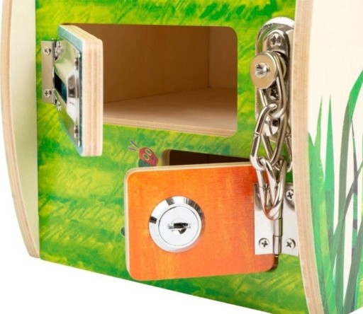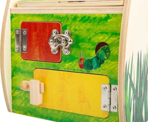 Дерев'яний будиночок із замками. Дуже голодна гусениця Small Foot Design — це чудовий набір, створений з урахуванням потреб дітей. Відкривати та закривати захищені відсіки та знаходити ті, що мають фальшиве дно, — чудова й активна розвага. Окремі засуви, ланцюжки, замки та важелі мають великий вплив на дрібну моторику та здібності найменших. Окремі елементи виготовлені з дерева та металу, щоб вони могли служити своїм власникам довгі роки.