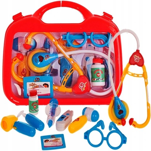 Набір «Доктор» упакований в гарну валізу, яку можна брати з собою куди завгодно.Елементи набору є імітацією справжніх медичних інструментів.