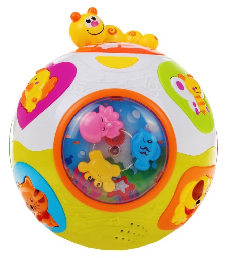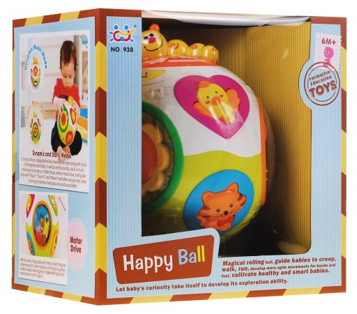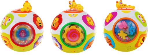 М'яч, що обертається, супроводжується миготливими різнокольоровими вогниками та кумедними звуками, які заохочують малюка грати та передавати м'яч. М'яч оснащений різними кнопками у формі різнокольорових тварин.