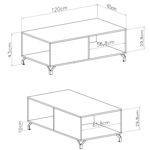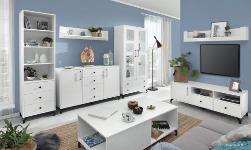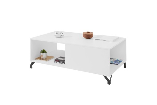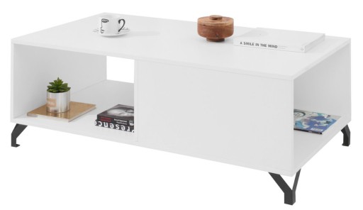 Журнальний столик Bergen BE10 120 x 43 x 65 білий в сучасному скандинавському стилі, має функціональну полицю під стільницею розміром приблизно 57 x 30 x 62, асиметричний поділ полиць додає шарму, дозволяючи цікаво виставити речі розміщені там.