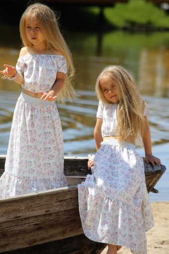 Довга дівоча біла спідниця з ніжними пастельними квітами. Спідниця для дівчинки на гумці, оброблена більш широким воланом.