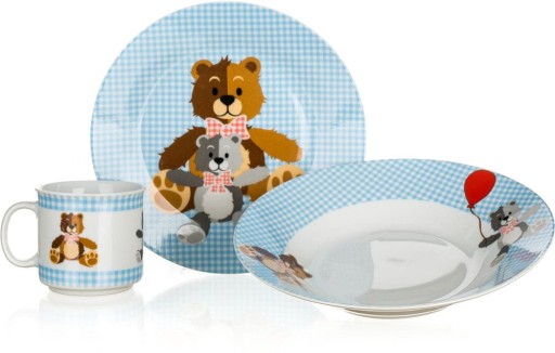 Дитячий набір TEDDY BEAR з 3 предметів включає: мілку тарілку 20 см, глибоку 20 см, кухоль 210 мл, керамічний матеріал.
