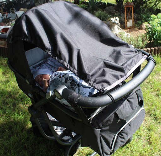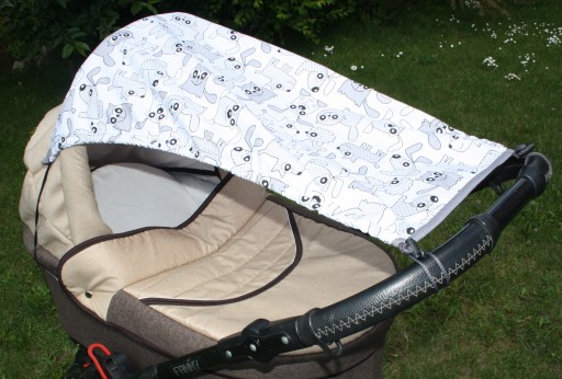 Дах кріпиться за допомогою гумової стрічки, пропущеної через капот. Спереду він прив'язаний двома зав'язками до ручки візка. Крім того, навіс можна регулювати за допомогою струни і стопорів.Залежно від кута падіння сонячних променів можна зрушити чохол вбік, регулюючи їх на мотузках і гумці.