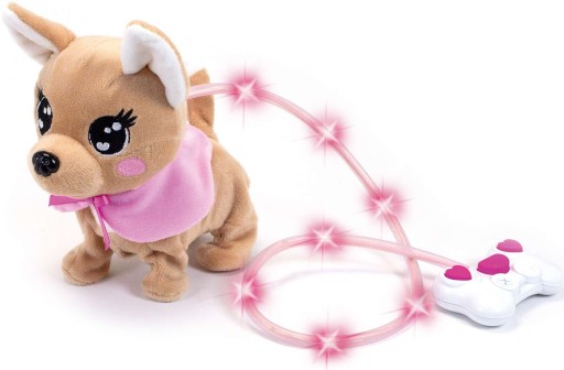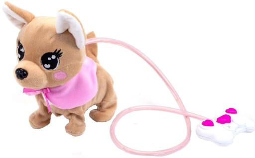 Маленький песик маєхутро бежевого кольору як справжня собака чихуахуа. Має великі вишиті чорні очі та пластиковий чорний нісодягненийзнаходиться в маслірожева накидкаЩеня можекерується за допомогою пульта. Собака можегавкає, ходить і виляє хвостом,і йогошнурок світиться.